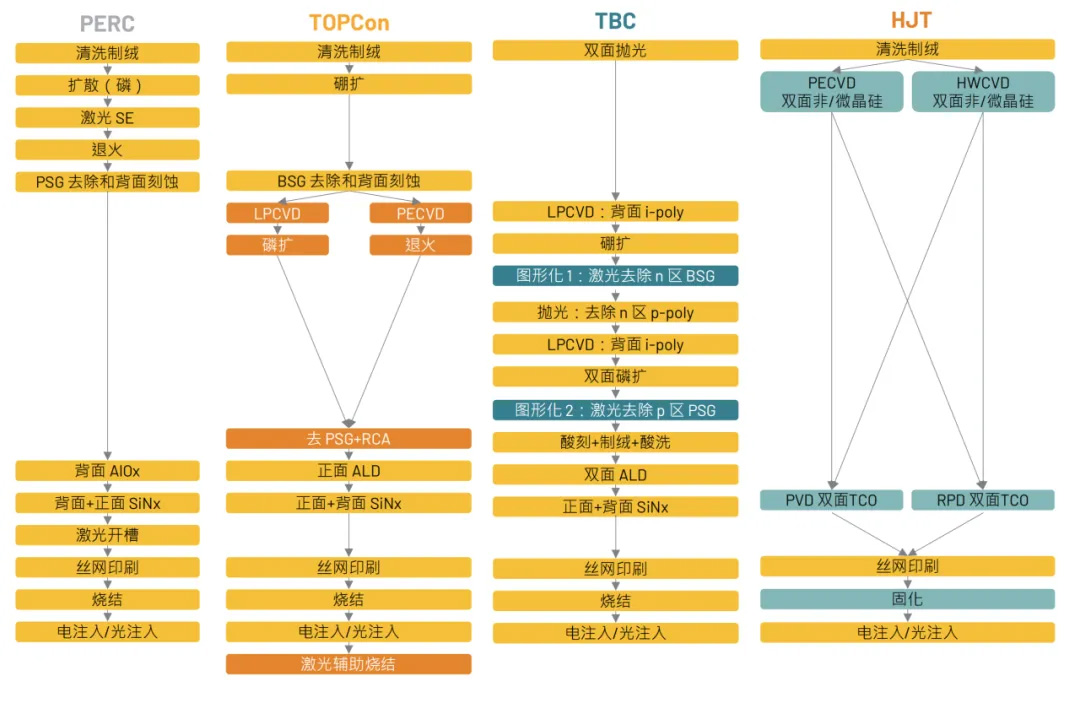 太陽電池は太陽光発電産業チェーンの中核を成す要素であり、その変換効率は太陽光発電システムの発電性能に直接影響を及ぼします。現在、市場に出回っている主な太陽電池技術には、PERC、TOPCon、HJT、xBCなどがあります。変換効率の理論上の上限は、技術パスによって異なります。PERCは24.5%、TOPConは28.7%、HJTは28.5%、xBCは29.1%です。量産時の変換効率は、PERCが約24%、TOPConが約26%、HJTが約26%、xBCが約27%です。